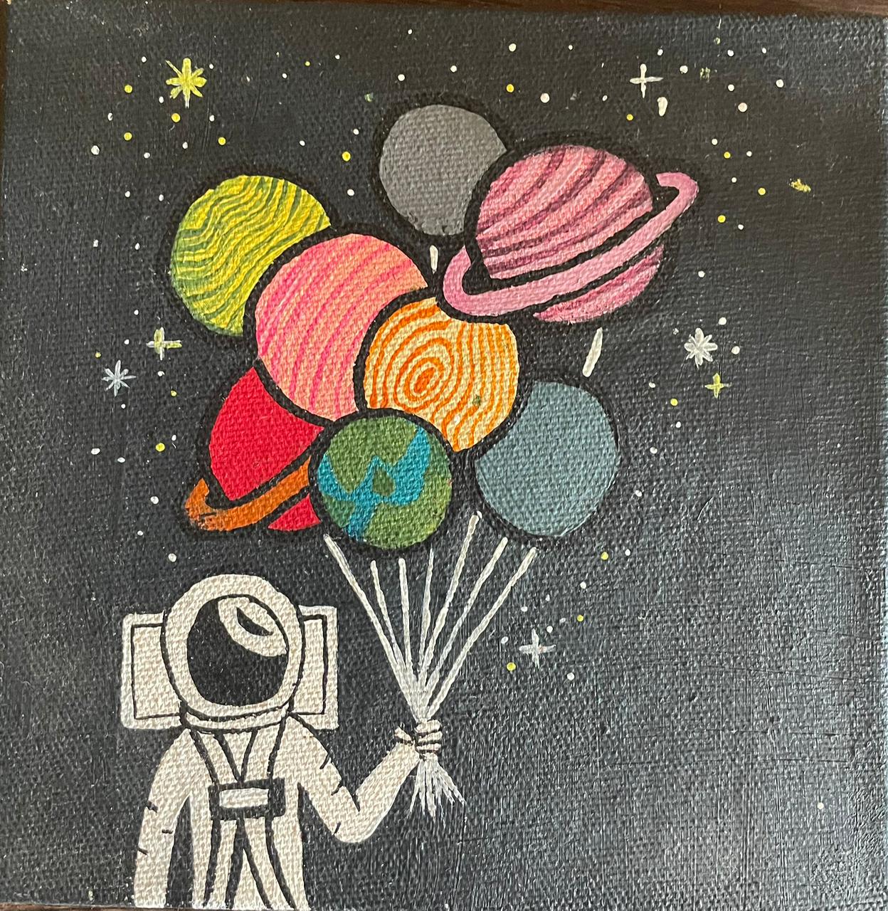 This painting features a whimsical astronaut floating in a star-filled cosmos, holding a bouquet of vibrant, swirling planets. The deep black background contrasts beautifully with the colorful planets and shimmering stars, creating a sense of wonder and adventure. Painted on a 6″ x 6″ canvas board, this piece is the perfect size to add a touch of cosmic charm to any shelf, desk, or gallery wall.