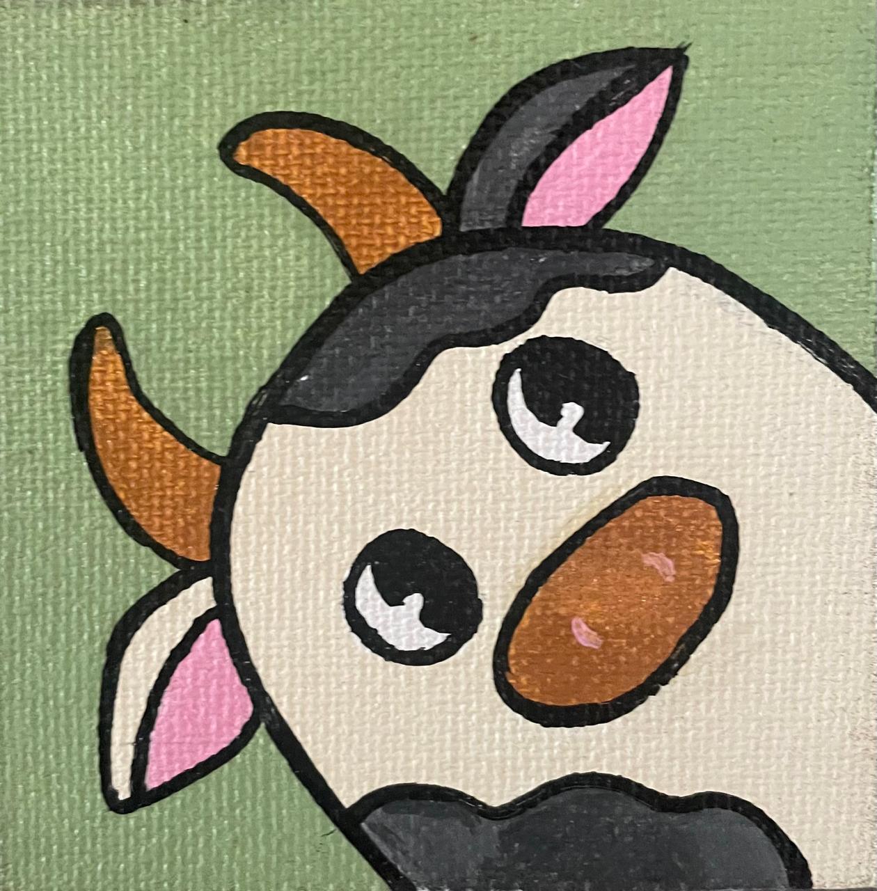 “Moo-dy” Millie the Cow. A charming and curious inch original painting! Millie is shown peeking out with those big, innocent eyes. This funky mini-canvas magnet is guaranteed to add country charm to any metal surface.
